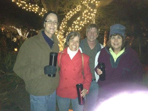On Tuesday night we went to see Las Noches de las Luminarias at the Desert Botanical Garden. It was absolutely stunning. The paths throughout the garden are lined with luminaries and the numerous palo verde trees throughout the garden are lit with white lights. Those trees are so sculptural … it was absolutely stunning. I have included a picture of us from that evening … you can see a palo verde tree in the background. We were dressed warmly because it was rather chilly that night, with forecast for rain (it didn’t come). The outing was a Christmas gift from Cathy’s sister, Mary, and her husband, Kevin. It was a great gift. In addition to just strolling around and enjoying the scenery, there were performers located throughout the garden to enjoy, which definitely added to the festive atmosphere.